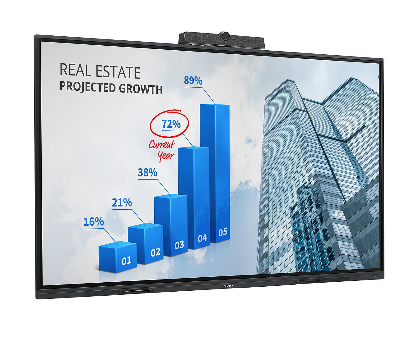 An optional PNZCMS1 AV Soundbar is also available allowing for more engaging video conference experience. This all-in-one unified communication soundbar features a speaker, microphone and camera integrated into a single cross platform device. Its high quality sound provides best solution for large rooms without compromising the sound clarity. The 6-array microphones pick up voice firmly and cancel echoes while reducing noise. With a single USB-C cable connection the soundbar features simple integration with Sharp PNL2B series interactive displays.