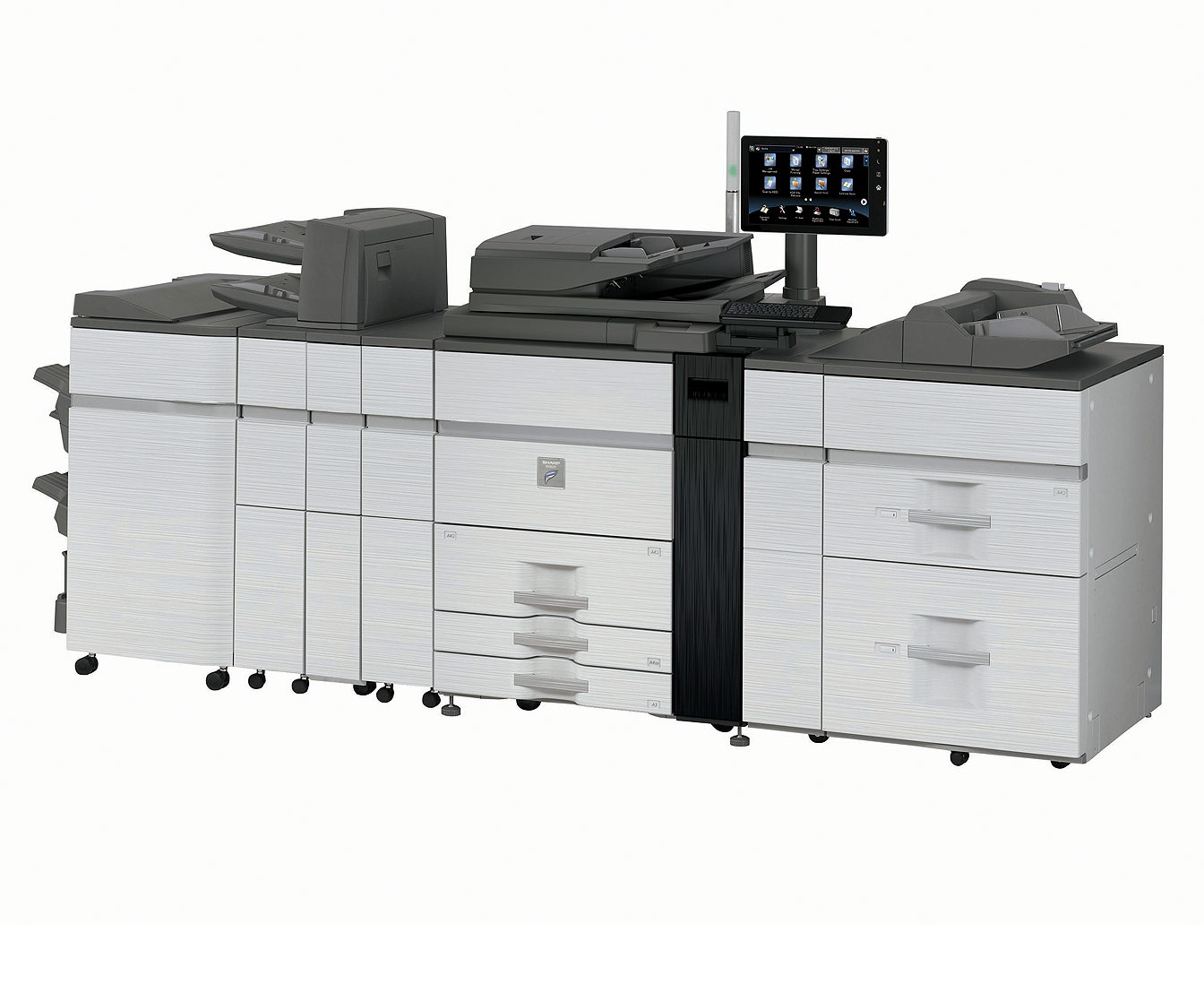 Available 5,000-sheet paper stackers with roll-out carts can be connected in tandem for unattended operation of up to 10,000 sheets.