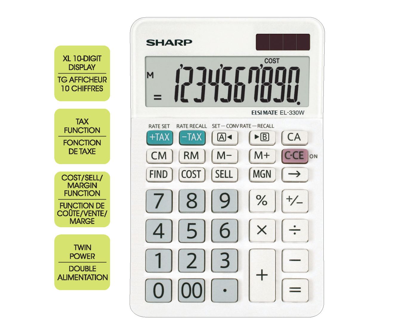 Cette calculatrice de bureau professionnelle à 10 chiffres est parfaite pour les professionnels à la maison ou au bureau. Le modèle EL330W est fini dans un design blanc moderne et dispose d'un grand écran LCD incliné et de touches en plastique durable. Les touches de coût / vente / marge permettent un calcul rapide et facile de la marge bénéficiaire.
