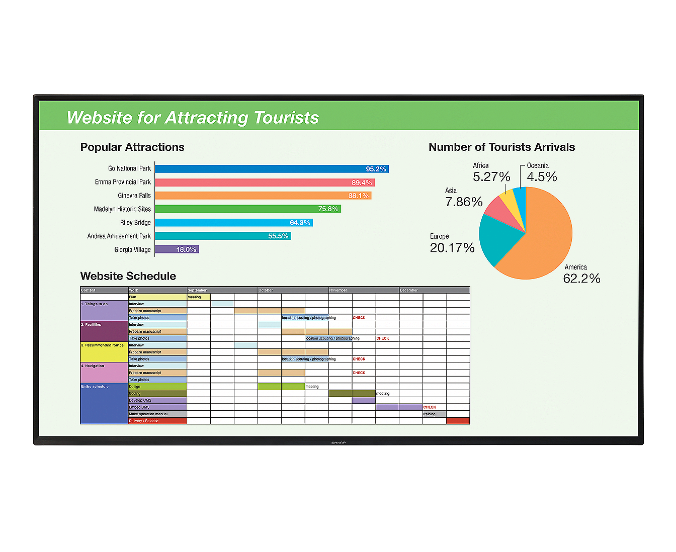 Donnez de l’ampleur à votre message : passez-le sur un affichage ACL commercial de Sharp! Que vous choisissiez le modèle de catégorie 60" (60,1" sur la diagonale), de catégorie 70" (69,5" sur la diagonale) ou de catégorie 80" (80,0" sur la diagonale), la nouvelle Série 4TB d’affichages commerciaux Sharp présente votre message dans toute la précision et la toute la vivacité qui sont le propre d’une résolution 4K Ultra-HD. Le profil mince et les lignes pures semblent contredire les maintes caractéristiques incorporées dans cet écran, incluant un syntoniseur et d’autres fonctions utiles pour les applications commerciales. Dans un hôpital, un bureau ou un commerce de détail, la Série 4TB est conçue pour attirer l’attention de votre public, et le garder informé, diverti et engagé.