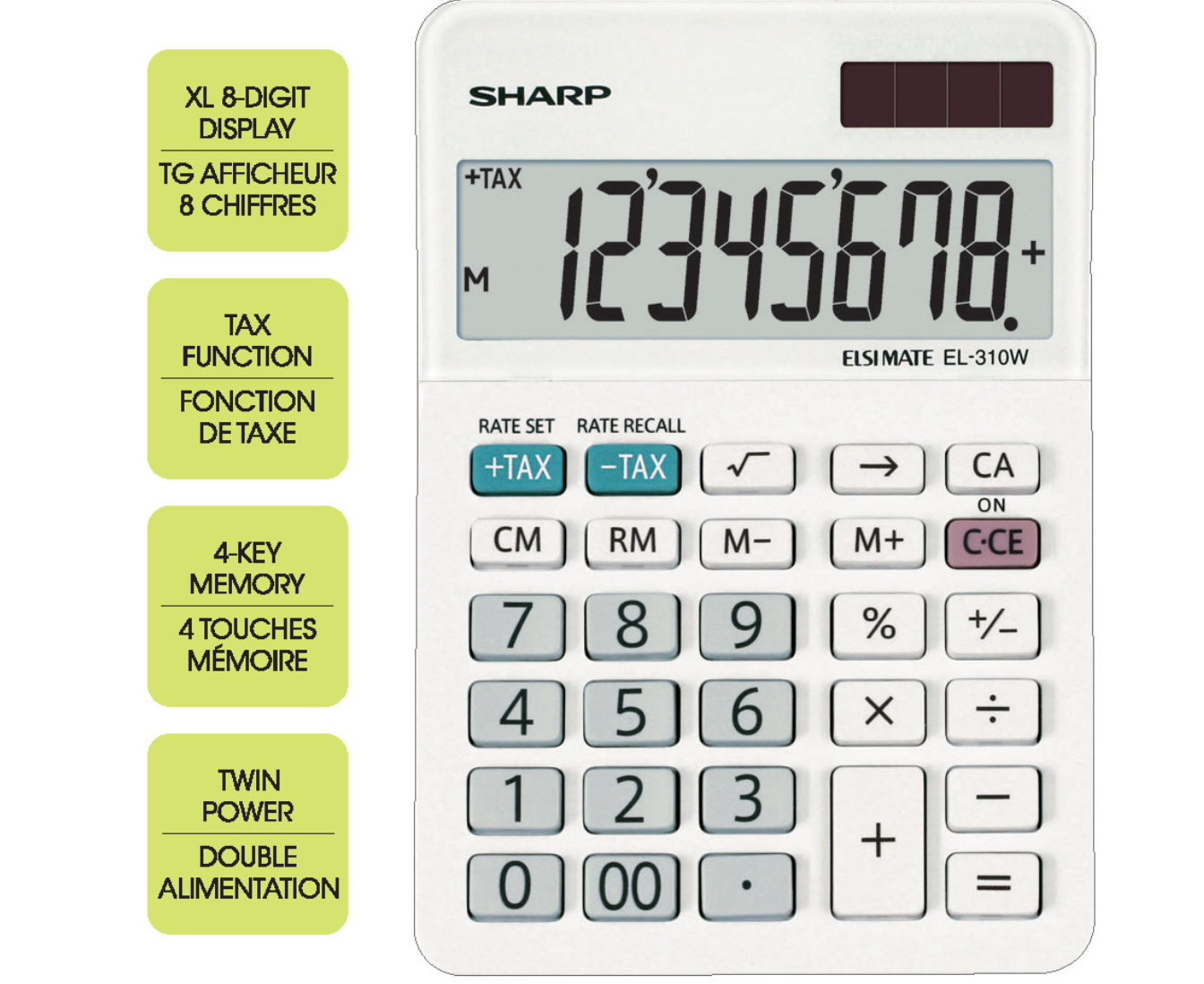L'EL310W présente une finition blanche moderne et dispose d'un grand écran LCD incliné et de touches en plastique durable. La mini calculatrice de bureau professionnelle à 8 chiffres est parfaite pour les professionnels à la maison ou au bureau. Les autres fonctions incluent : les touches de taxe automatiques, la touche de pourcentage, la touche de racine carrée, la touche d'espace arrière et la mémoire indépendante à 4 touches comprenant la mémoire plus, la mémoire moins, la mémoire de rappel et la mémoire d'effacement. Clé Plus extra-large et mise hors tension automatique. Fonctionne sur double alimentation (solaire/batterie de secours).