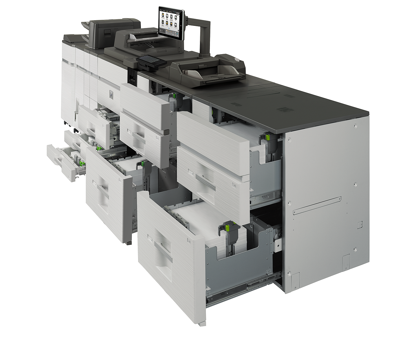 Capacité de papier de jusqu’à 13 500 feuilles avec une prise en charge de grammages jusqu’à page de couverture 110 lb. (300 gsm).